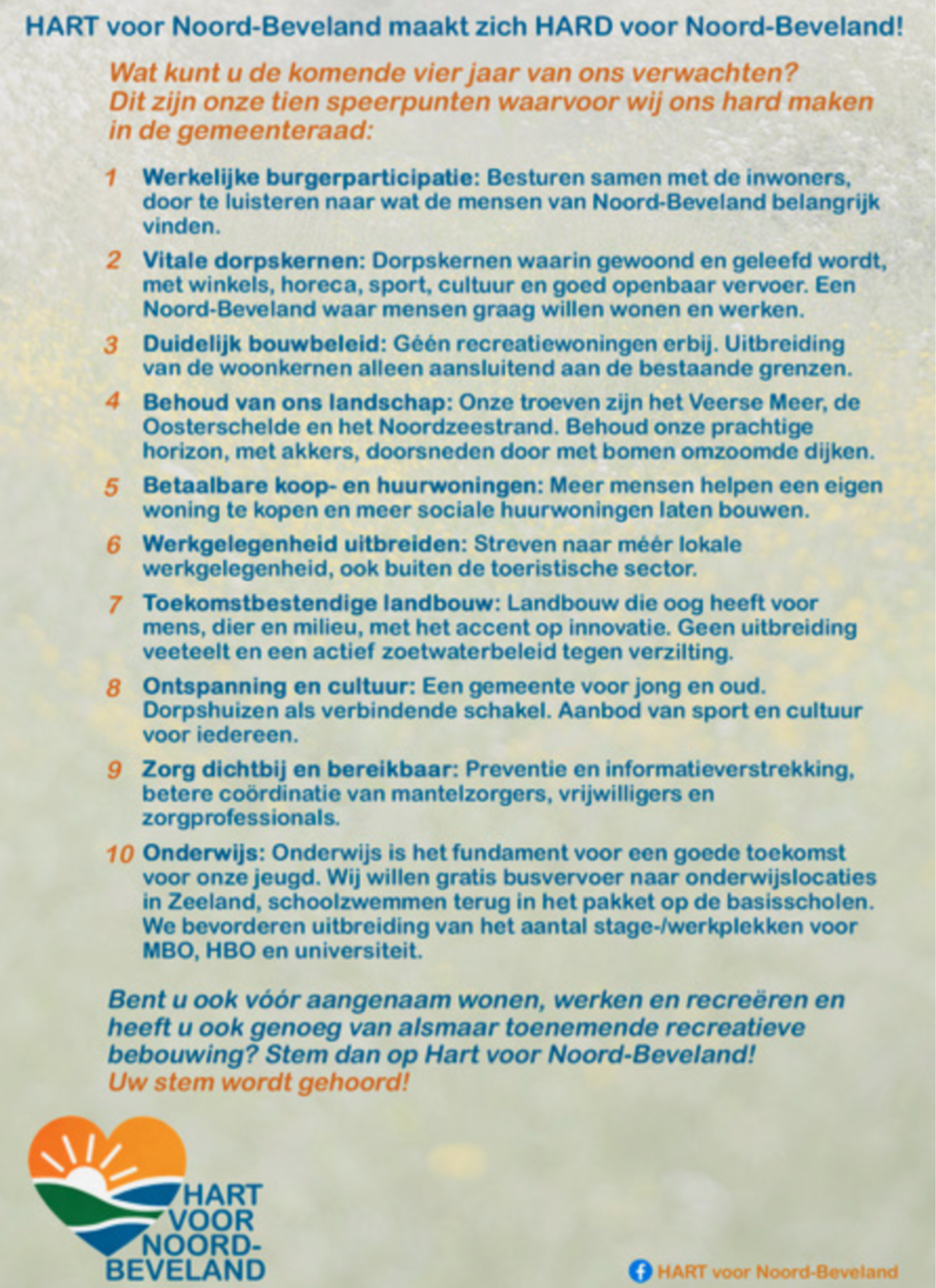 Hart voor Noord-Beveland is uw stem in de lokale politiek. Wij zetten ons in voor de belangen van onze inwoners, met de focus op meer samenwerking bij besluitvorming en een duidelijk standpunt tegen verdere toeristische uitbreidingen. Sluit u aan en bouw mee aan een betere toekomst voor Noord-Beveland.